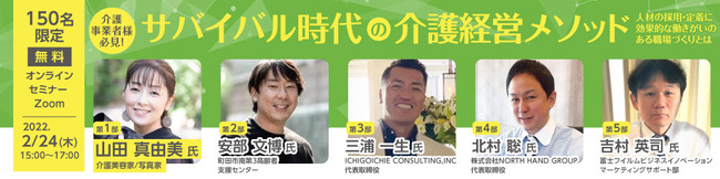 サバイバル時代の介護経営メソッド『人材の採用・定着に効果的な働きがいのある職場づくりとは』〜介護美容、介護DX、外国人材活用の取組み〜を、2022年2月24日(木)にオンラインで開催することをお知らせいたします。本セミナーは、 フィリピン介護人材のコンサルティング企業であるICHIGOICHIE CONSULTING,INC(本社:フィリピン、 代表取締役:三浦 一生)、 ITソリューション事業を展開する株式会社NORTH HAND GROUPの共同開催となります。