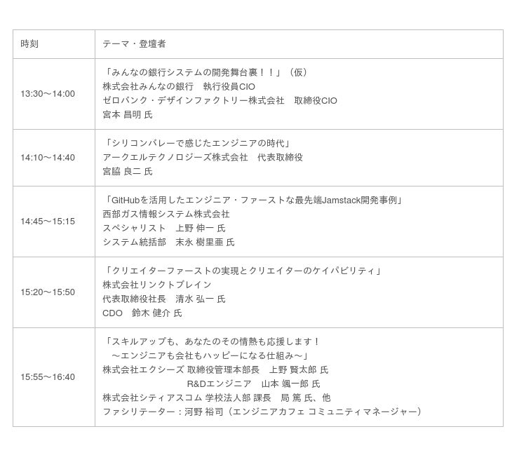このイベントでは、エンジニアにとってフレンドリーな環境を構築し、新しいものを生み出している先駆者たちから、その「最初の一歩」、「その後のプロセス、試行錯誤の過程」について話を聞き、エンジニアが成長・活躍し、時代を拓いていくために必要なこと、自分の働く場でも実践してほしい、実践したいエッセンスを共有できたらと思います。