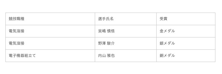 日立グループは、将来の製造現場を支える優秀な技能者の育成および技能伝承を目的として、1963年の第1回大会から毎年連続で出場しています。今大会には、日立ビルシステムから、「電気溶接」職種に3選手、「電子機器組立て」職種に2選手が参加し、「電気溶接」職種では、宮嶋慎悟選手が金メダル、野澤駿介選手が銀メダル、「電子機器組立て」職種では、内山雅也選手が銅メダルを獲得しました。