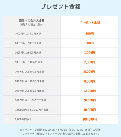 ※キャンペーン開始前の6月6日〜6月26日(6日、13日、20日)に引落しのボーナス積立はキャンペーン対象の合計入金額に加算されます。
