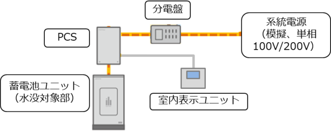 令和3年10月末にエリーパワー株式会社と共同で実施した「NITE検証水没試験」では、住宅用蓄電池システム(エリーパワー社製:POWER iE5 GRID)の使用中に浸水被害に遭ったケースを想定し、系統電源及び分電盤を接続した状態で水没試験を実施しました。その結果、蓄電池システム由来の二次災害は起きず、安全にシステムが停止することを確認しました(図A及び写真1参照)。