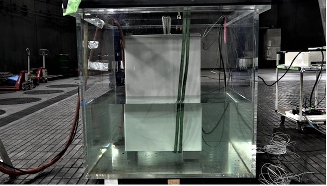 大型蓄電池が水没した際の製品状態を検証する試験の様子