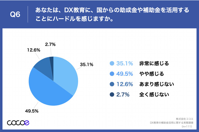 「Q6.あなたは、DX教育に、国からの助成金や補助金を活用することにハードルを感じますか。」(n=111)と質問したところ、「非常に感じる」が35.1%、「やや感じる」が49.5%という回答となりました。
