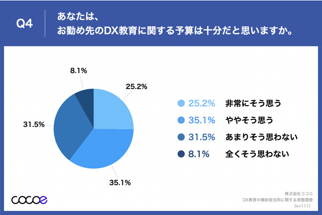 「Q4.あなたは、お勤め先のDX教育に関する予算は十分だと思いますか。」(n=111)と質問したところ、「あまりそう思わない」が31.5%、「全くそう思わない」が8.1%という回答となりました。