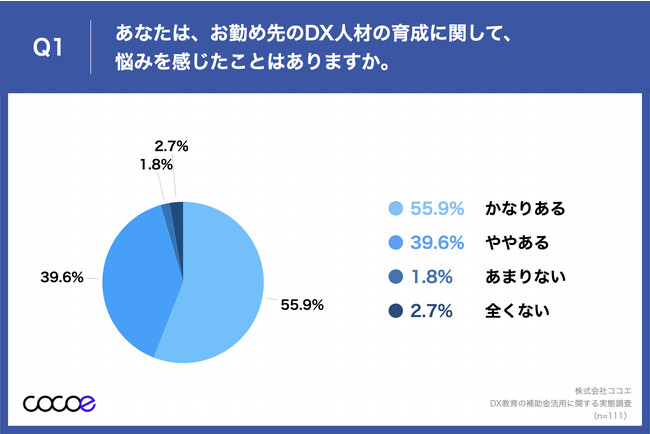 「Q1.あなたは、お勤め先のDX人材の育成に関して、悩みを感じたことはありますか。」(n=111)と質問したところ、「かなりある」が55.9%、「ややある」が39.6%という回答となりました。