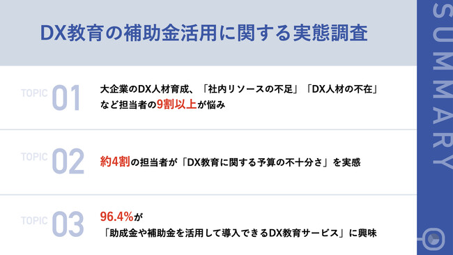 今回の調査では、人事担当者の多くがDX教育に関する予算やDX人材、社内リソースの不足に課題を感じている実態や、助成金や補助金活用についても活用のハードルが明らかとなりました。したがって大企業の多くは、低コストで補助金・助成金の申請サポートがあり、どんな方でも気軽に学習できるDX教育を求めており、今後は、大企業を中心にそのような特長を兼ね備えたサービスの需要が増加すると言えるのではないでしょうか。