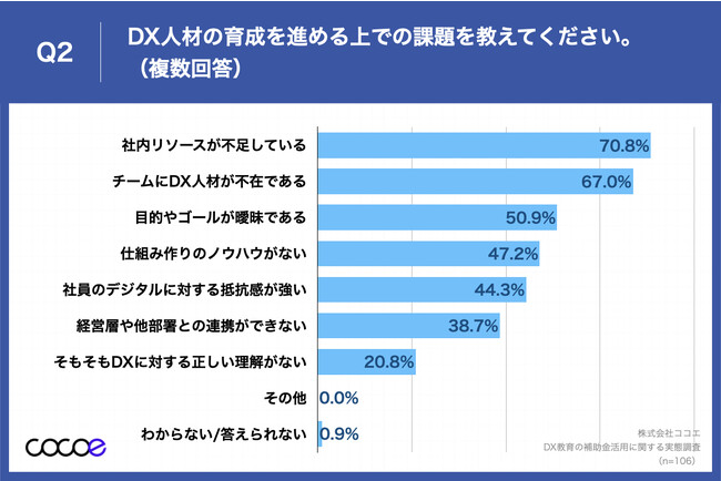Q1で「かなりある」「ややある」と回答した方に、「Q2.DX人材の育成を進める上での課題を教えてください。(複数回答)」(n=106)と質問したところ、「社内リソースが不足している」が70.8%、「チームにDX人材が不在である」が67.0%、「目的やゴールが曖昧である」が50.9%という回答となりました。