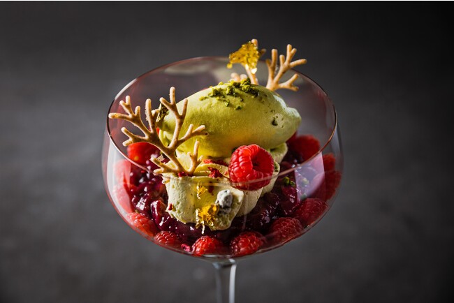 イタリアの老舗メーカー「BABBI」のピスタチオペーストをたっぷりと使用した濃厚で滑らかな舌触りのアイスクリームとフレッシュなフランボワーズ、ナパヴァレーの代表的な葡萄品種「ジンファンデル」とスパイスを合わせたジュレが大人のクリスマスを感じさせる華やかな余韻のパフェ。本場ヨーロッパのクリスマスをイメージしたパフェをお楽しみください。
