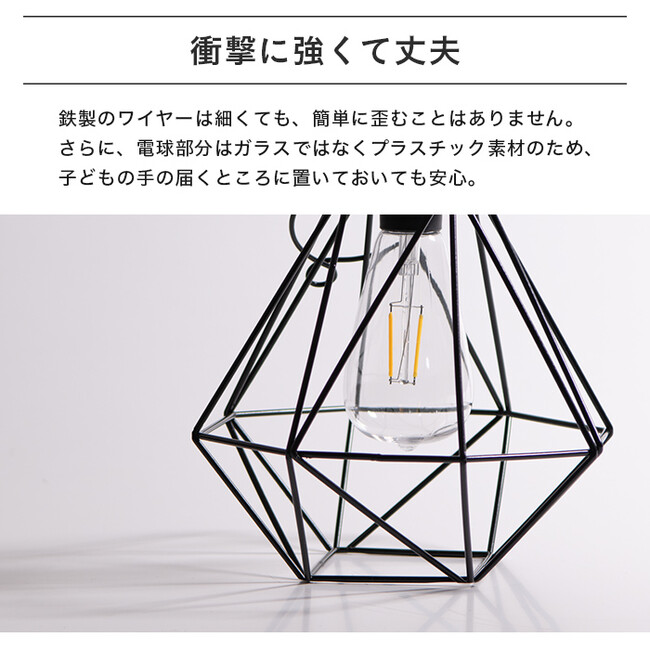 ワイヤーフレームは鉄製でできており、細くても歪みにくい作りとなっています。また、電球部分はプラスチック素材なので、衝撃に強く、うっかり落としてしまっても安心です。