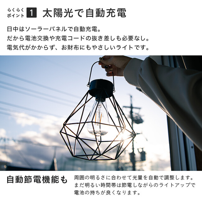 ソーラーライトだから、電気代はもちろん0円。自動節電機能を搭載し、夕方など周囲がまだ明るい時間帯は、節電しながらのライトアップ。電池の持ちを良くしてくれます。