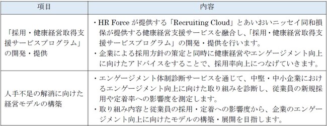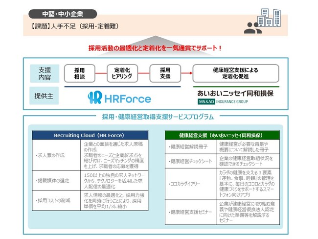 こうした中、HR Forceは、テクノロジーを活用した採用支援を行い、中でもデータ×AIで解決するサービス「Recruiting Cloud」では、求人検索エンジン等150以上の媒体と連携した独自のネットワークをもち、企業の人手不足の解決を支援してきました。あいおいニッセイ同和損保は、健康経営に関するセミナーの開催や、毎日の健康づくりをサポートする「ココカラダイアリー」の案内、健康経営支援保険の提供などを通じて企業の健康経営に関する取り組みを支援してきました。