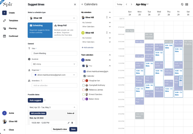 Spirは「相手も、自分も、思いどおりの調整を。」というコンセプトのもと、予定管理から日程調整まで、戦略的にタイムマネジメントができるビジネスカレンダーです。