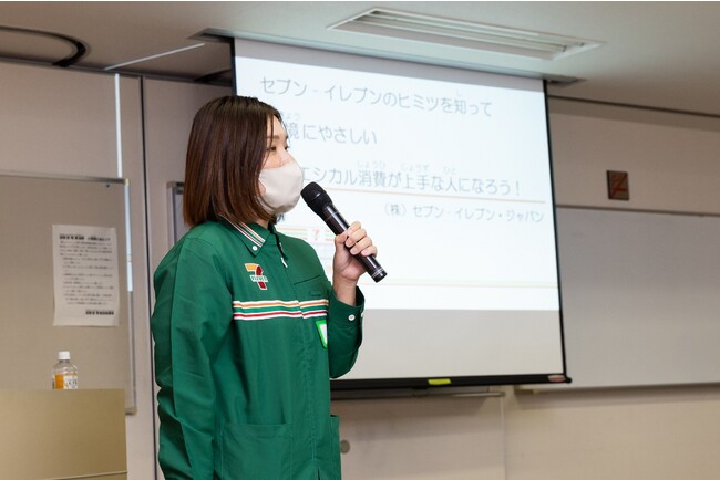セブン-イレブンのユニフォームを着用して、消費期限の近い商品を手前にして並べる体験や、消費期限の違う二つのおにぎりの食べ比べも体験し、自分にできるエシカル消費について実感を伴った学びがありました。