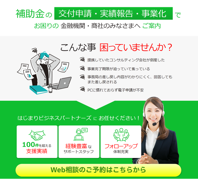 経営コンサルティング会社の株式会社はじまりビジネスパートナーズ(本社:埼玉県さいたま市 代表者:白川淳一)では、この度、北浜グローバル経営の倒産や補助金の公募申請のみ対応するコンサル会社と提携していて、補助金採択事業者にとって最も難解な交付申請や実績報告、事業化状況報告のサポートサービスを展開することで、金融機関・商社のみなさまが本来あるべき対顧客業務に集中できる環境を整えます。また、当社の誇る伴走型支援システムとして「OLTUSでのテスト販売」や「システム構築支援」などを通して、補助事業を早期に軌道に乗せるお手伝いもいたします。特設サイト設置しました。https://hajimari.co.jp/hojokin-support