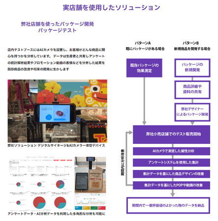 また当社では、AIカメラを使ったマーケティング分析ができるOLTUSでのテスト販売やWEBサイトの制作、パッケージデザイン、商品開発支援、販路開拓支援、HACCP等の衛生管理の導入、AIシステムの開発による経営効率化支援などのこれまで培ってきたコンサルティングノウハウを活用したカスタマーサクセスメニューをご用意しております。