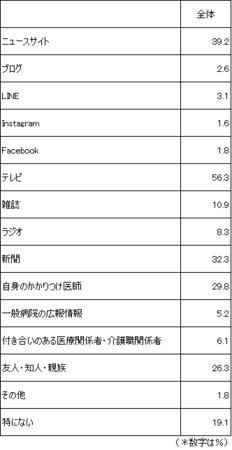 次に、病院や健康の情報をどこから入手いているかという調査では、1位:テレビ(56.3%)、2位:ニュースサイト(39.2%)、3位:新聞(32.3%)となり、インターネット利用が(新聞以上に)多い結果となった。