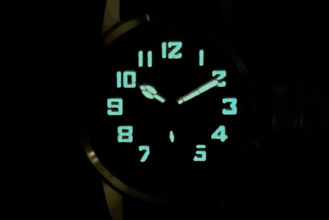 時字はあえてアンティーク調にしている。当時の蓄光のインデックスは経年劣化の為、白からオレンジがかった茶色に変色し、所々剥離もが起こる。これが程良いヴィンテージ感を引き出しており、再現に工夫を凝らした。