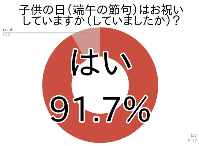 今回のアンケートでは、子供の日に端午の節句の飾り付けをする・していたと答えた方は91.7%でした。男の子のお子様がいらっしゃるご家庭はもちろんですが、そうでない場合にも、恒例行事として鯉のぼり等を飾ったりする方が多いようでした。子供の日が日本人の生活に深く浸透している伝統ある年中行事であることが伺えます。このあとのアンケートでも、日本の伝統を大切にし、季節感を感じて子供の日を祝っていることがよく分かる結果となっているので、詳しくお伝えしていきましょう。