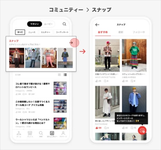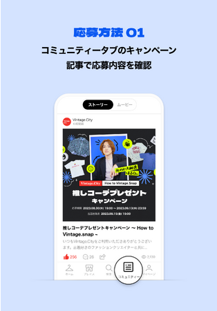 STEP1.ヴィンテージ・ファッション・アプリ「Vintage.City(ヴィンテージ・シティ)」内の「コミュニティ」ページに公開される「キャンペーン記事」で応募内容を確認。