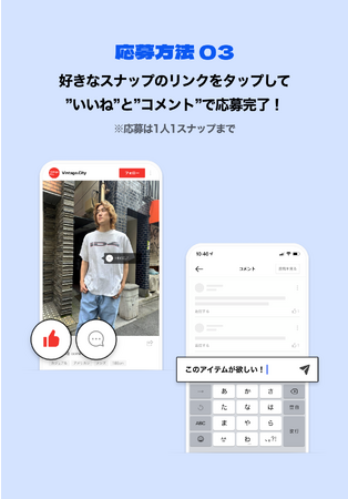 「推しコーデプレゼントキャンペーン」は、古着好きのファッションクリエイターが、Vintage.Cityに掲載されている1,000店舗以上の古着屋の中から、お気に入りの古着屋に訪問し、組んだ全身コーディネートをプレゼントするキャンペーンです。ユーザーは、Vintage.Cityアプリの「スナップ機能」に投稿された、ファッションクリエイターご本人が着用したいくつかのスナップから好きなコーディネートを選んで応募することができます。