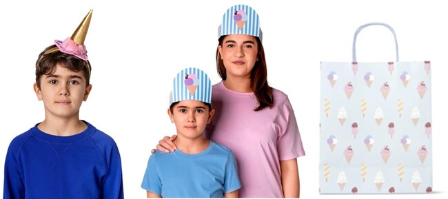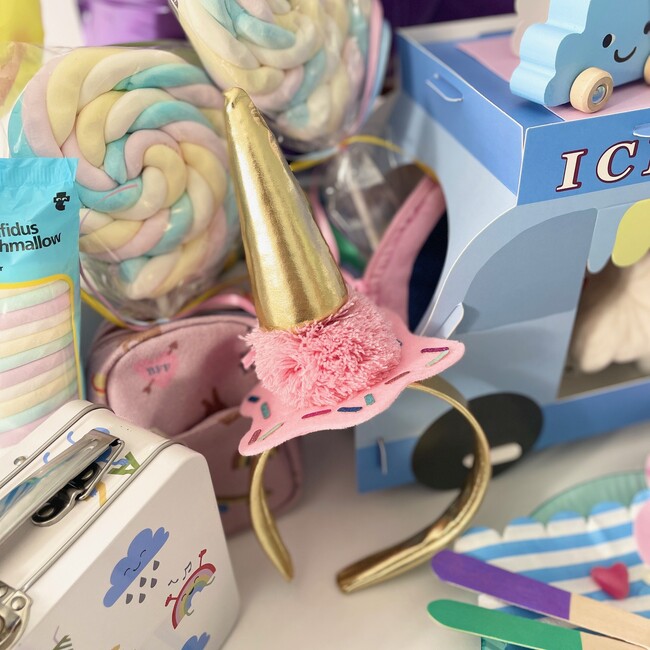 ゴールドのコーンがかわいいカチューシャと、アイス屋さんのハットでパーティーを盛り上げる!プレゼントを入れるバッグもお揃いでどうぞ!