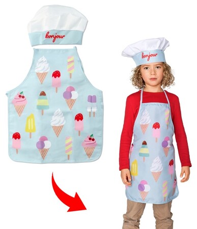 テントとセットでどうぞ。色々なアイスが描かれたエプロンと「bonjour」のロゴが入ったハット付き
