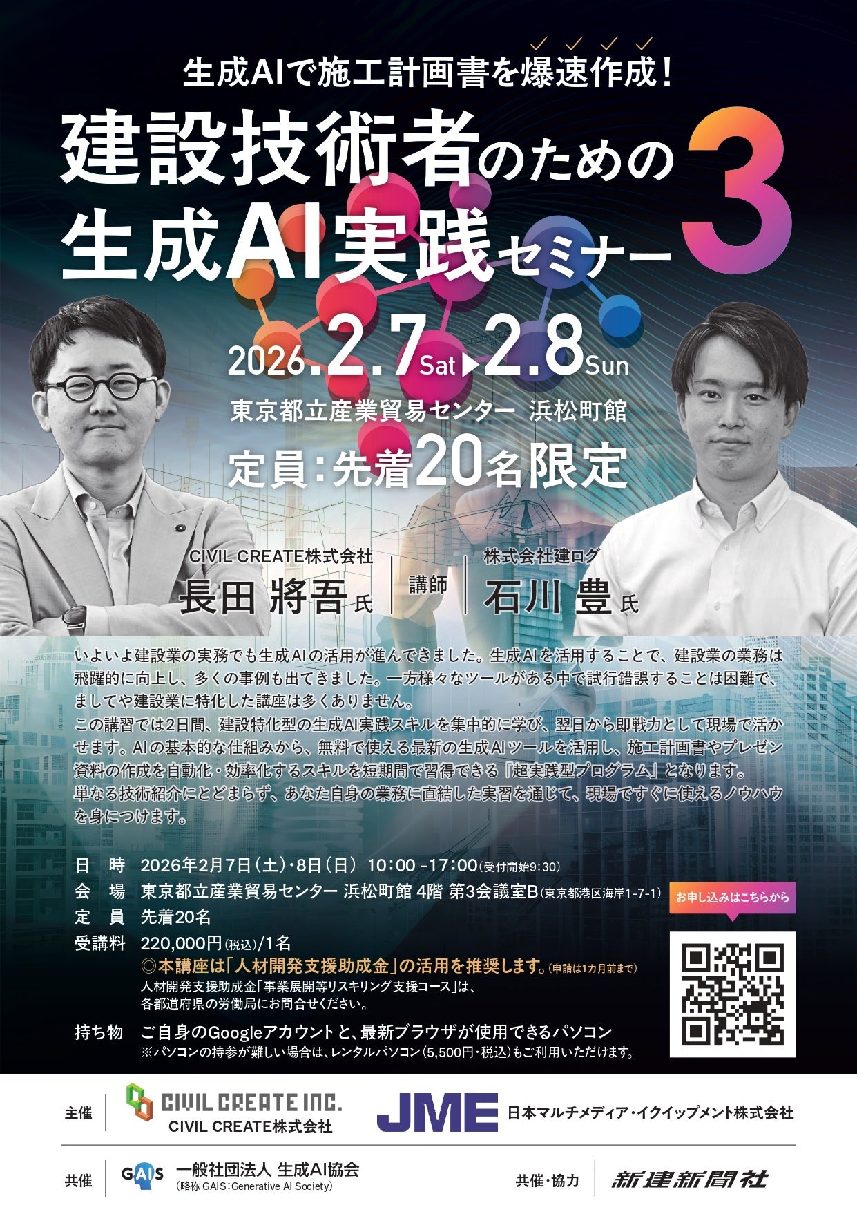 本セミナーは、CIVIL CREATE 株式会社、日本マルチメディア・イクイップメント株式会社、 株式会社新建新聞社、一般社団法人生成 AI 活用普及協会(GAIS)の 5 社共催により実施 され、現場で即活用できる生成 AI スキルを短期間で習得できる内容となっています。