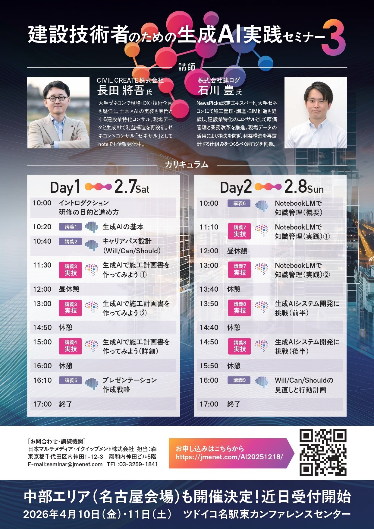 第一回・第二回ともに即満席。実務で使えると評価される生成 AI 実践セミナーが、 待望の【第三回・東京開催(2026 年 2 月 7 日(土)・8 日(日))】決定。 さらに好評につき、【第四回 名古屋開催も決定】