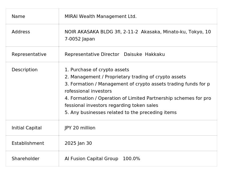 MIRAI Wealth Management Co., Ltd. (hereinafter “MWM”), a subsidiary of AI Fusion Capital Group Corp., is pleased to announce that it has entered into a strategic partnership (hereinafter the “Partnership”) with Re7 Capital Ltd (hereinafter “Re7”), one of the world’s leading crypto asset investment firms with a track record of deploying approximately $1 billion USD for institutional investors and high-net-worth individuals globally.
