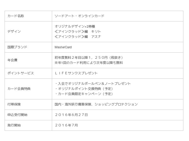 ライフカード株式会社は、人気アニメ「ソードアート・オンライン」とコラボレーションしたクレジットカード「ソードアート・オンラインカード」を発行し、2016年6月27日より会員募集を行います。