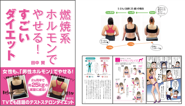 田中トレーナーは、2ヶ月半で―25kgの減量を成功させた実績があり、テストステロンダイエット(R)というダイエット法を提唱しています。そのダイエット法のノウハウや体験談を紹介した実用書、講談社「燃焼系ホルモンでやせる!すごいダイエット」を出版しています。この本は単行本と電子書籍があり、Amazonで購入することができますが、現在AmazonのKindle Unlimited会員は読み放題の無料*で読むことが可能です。*(今後変わる場合あり)