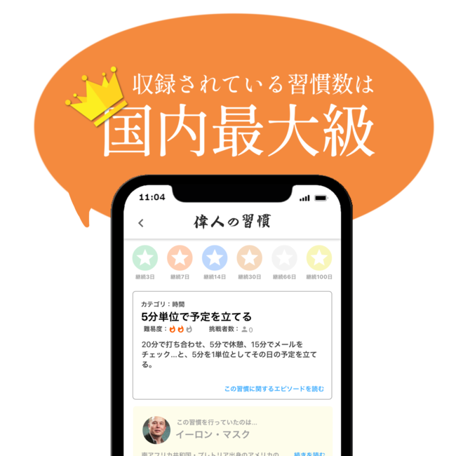 ナポレオン、スティーブ・ジョブズ、イチローなど成功を収めた偉人たちが行っていた習慣を国内最大数収録。”圧倒的低価格”と”高速開発”で今話題の「ノーコード」で開発された新世代のスキルアップアプリ。