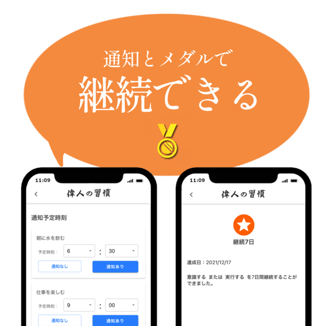 継続して習慣に取り組むとメダルが貰える”メダル獲得機能”により、ゲーム感覚で楽しく続けることができます。