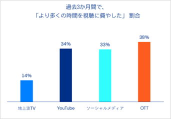 過去3ヶ月にコンテンツを視聴するために費やした時間が長い行動として、「OTTでの視聴」を挙げた人が1位(38%)、次いでYouTube(34%)、ソーシャルメディア※※(33%)、地上波TV(14%)とOTTで時間を過ごしている人が多い
