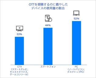 OTT視聴に際して、使用しているデバイスのトップ3はPC(52%)、スマートフォン(44%)、コネクテッドTV(33%)