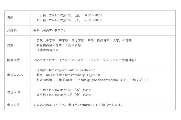 ・保護者向け応募フォーム:https://igs-forum2021.peatix.com