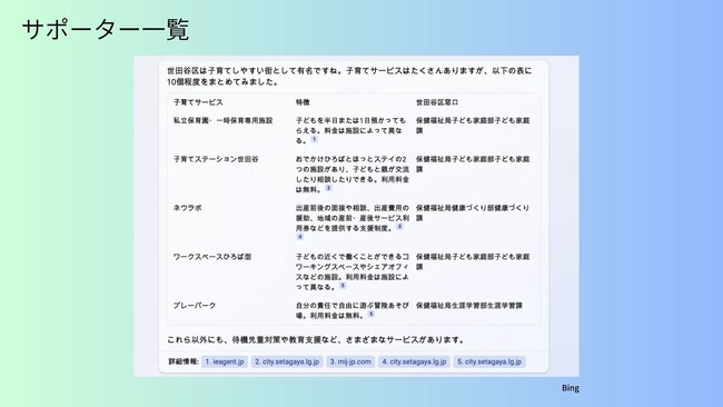 自治体の子育てサービスの窓口をAIチャットで一覧出力します。