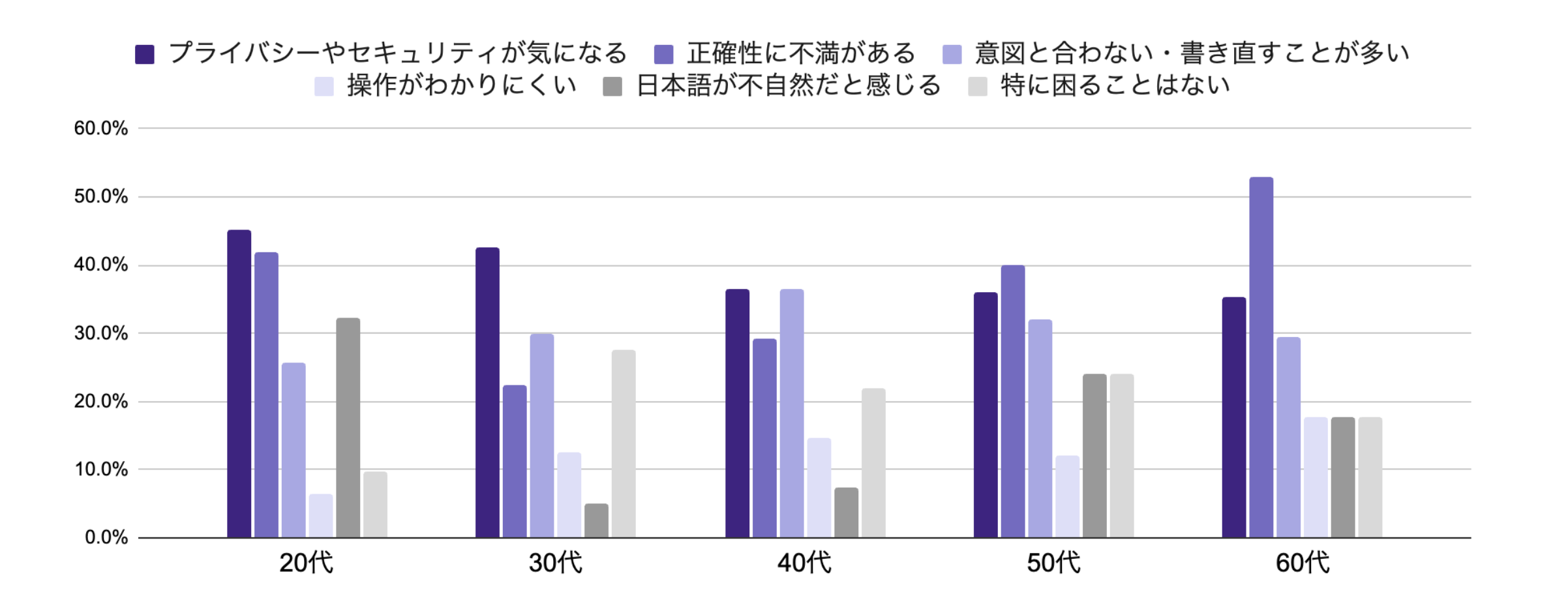 さらに、年代別に見てみると、20代は「日本語が不自然だと感じる」と回答した割合が他の世代より高い傾向にあり、60代以上は「正確性への不満」が高い結果となりました。