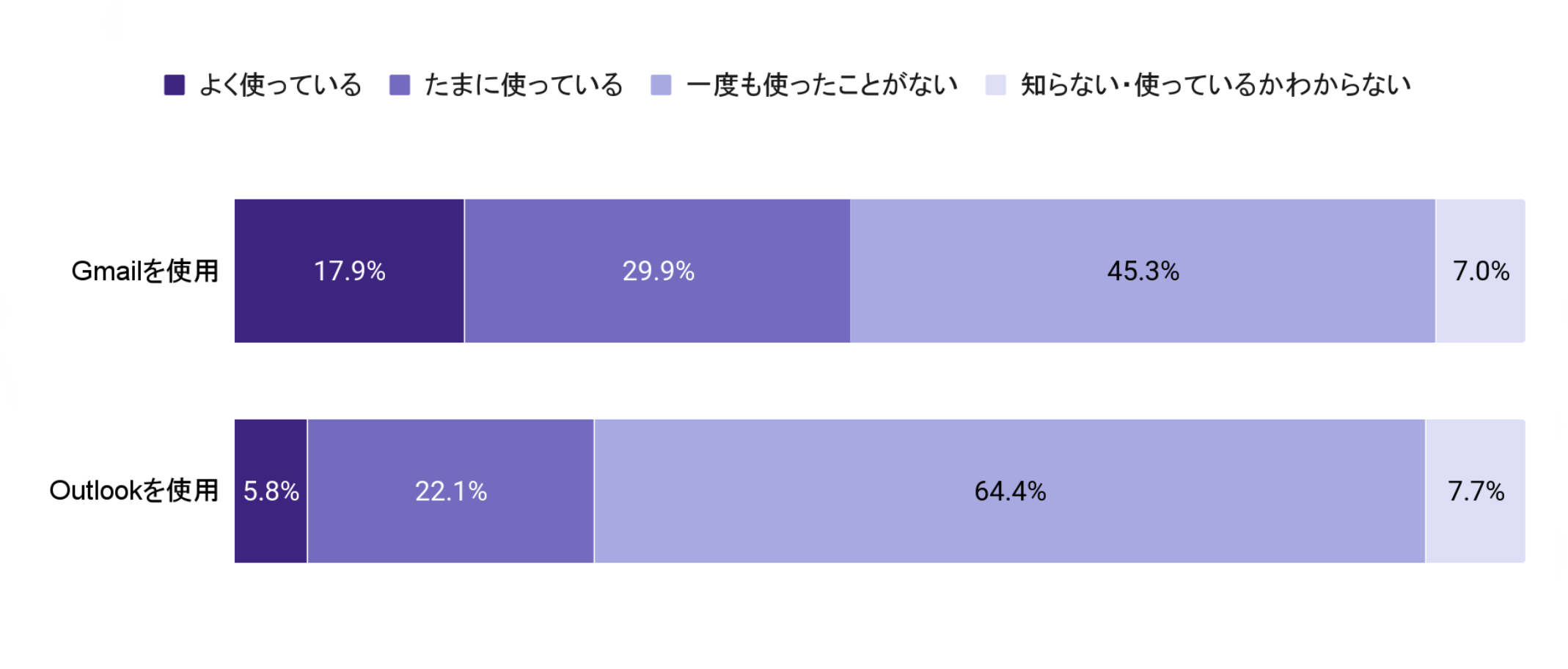 メールサービス別に見てみると、Gmailユーザーの方が生成AI機能の利用率は高く、「よく使っている」と回答した方はGmailがOutlookより12.1ポイント高い結果となりました。
