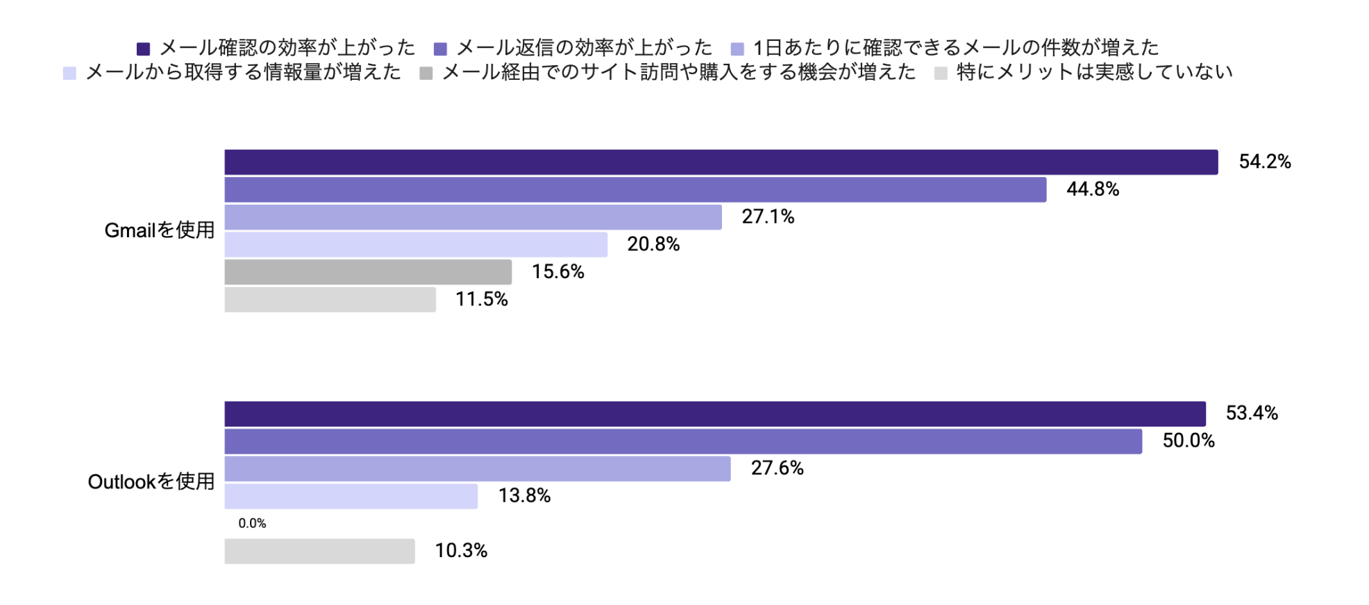 また、メールソフト別に見てみると、GmailとOutlookのいずれも「メール確認の効率が上がった」が最も多い結果となりました。