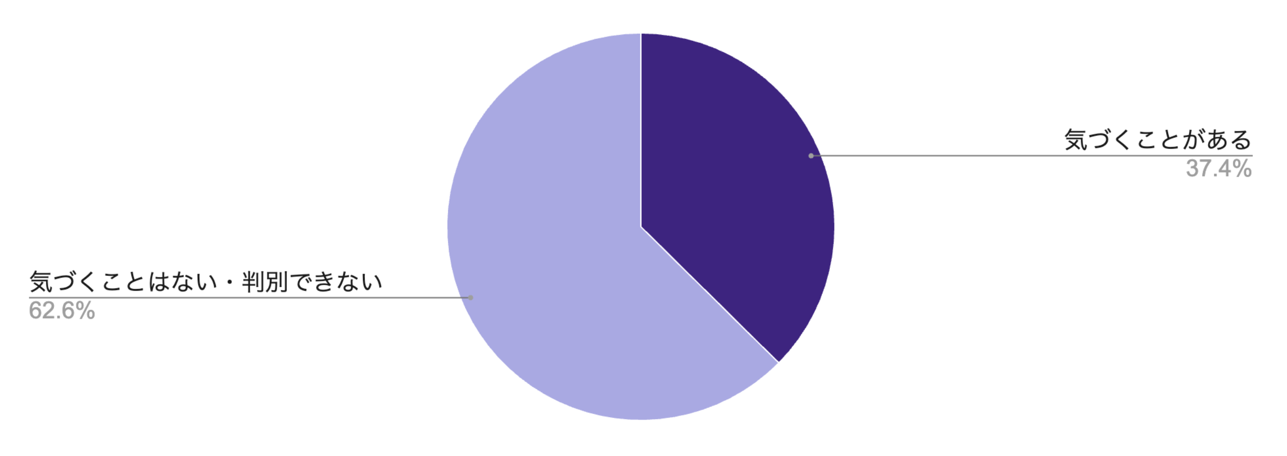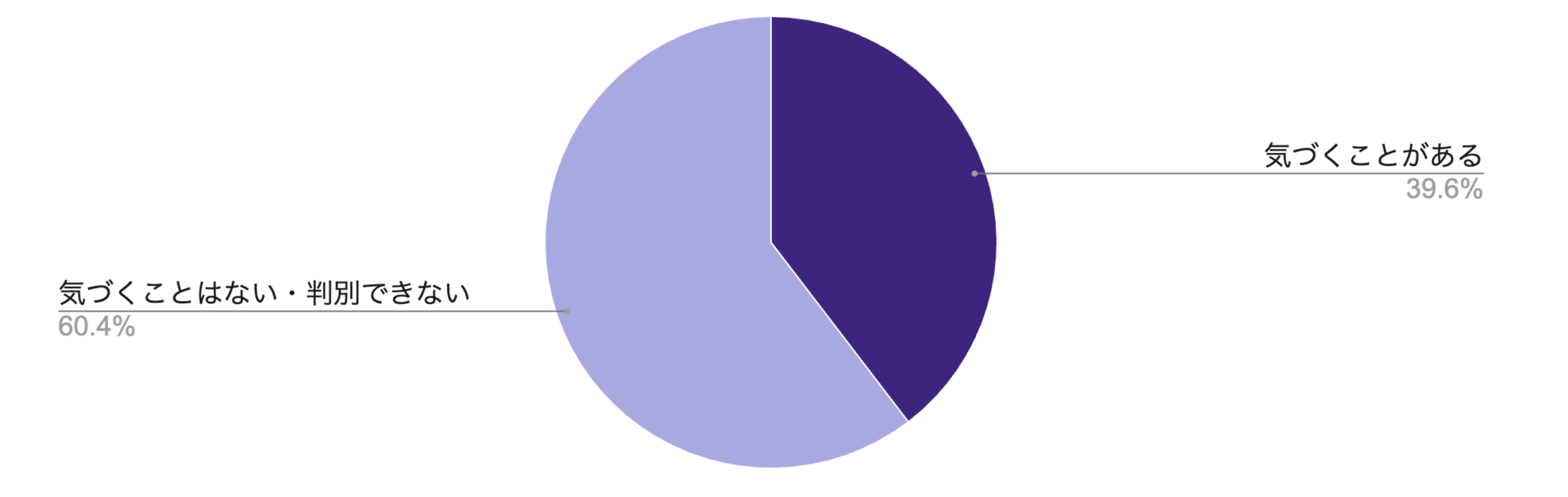 一方で、約4割弱は「気づくことがある」と答えており、AI特有のパターンを見抜ける利用者も一定数いるようです。こうした違いは、AIコンテンツへの慣れや経験の差によるものと考えられます。