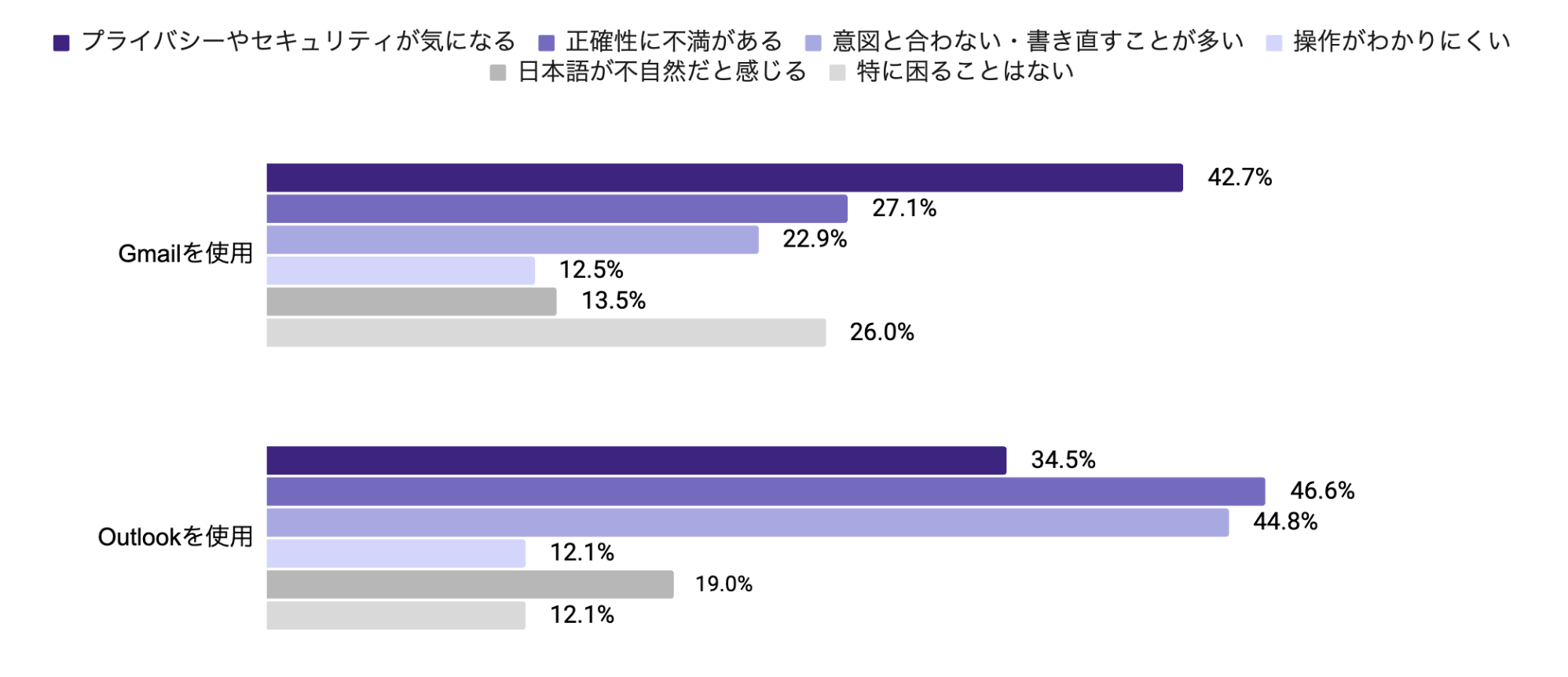 また、GmailとOutlookを比較したところ、Gmailは「プライバシーやセキュリティが気になる」、Outlookでは「正確性に不満がある」が最も多い結果となりました。さらに、Outlookでは「意図と合わない・書き直すことが多い」の回答がGmailより22ポイント程度高くなりました。