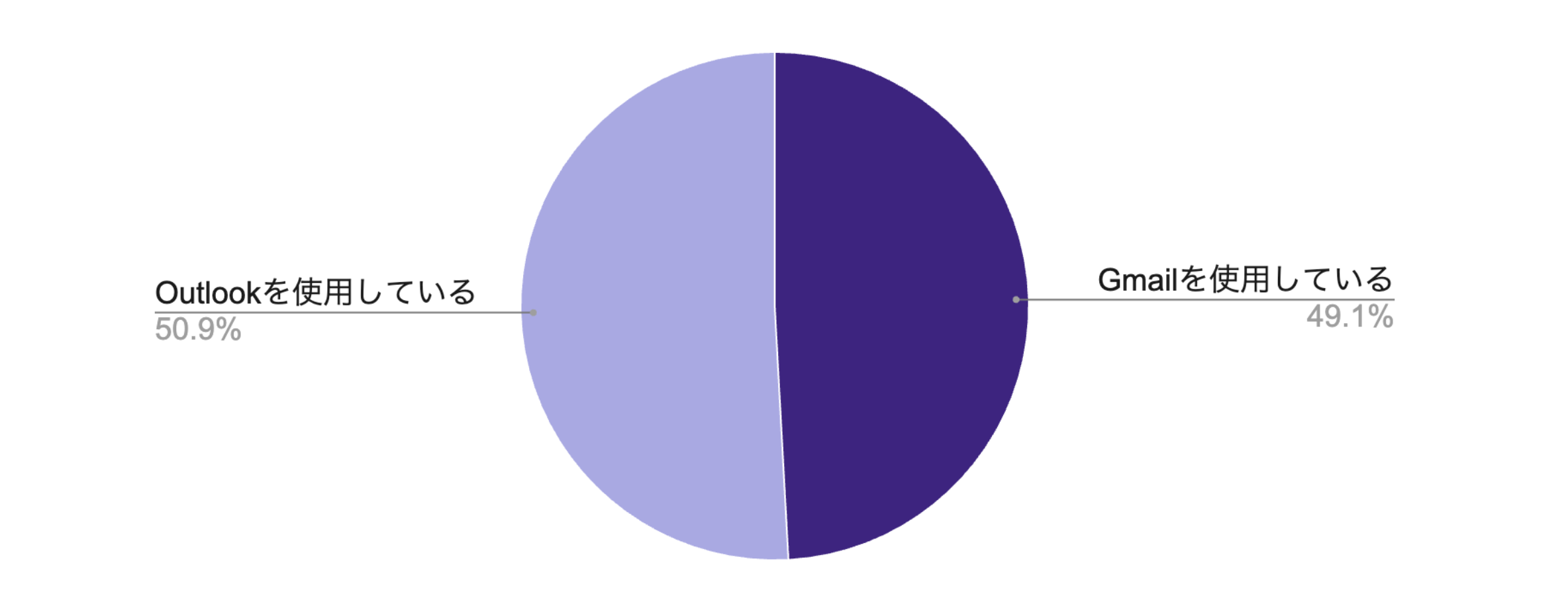 最初に、業務においてGmailとOutlookのどちらを主に利用しているか尋ねた結果がこちらです。[画像2: https://prcdn.freetls.fastly.net/release_image/81059/17/81059-17-a0a39647f047ec1271a6ff9f8024d641-2368x924.png?width=536&quality=85%2C75&format=jpeg&auto=webp&fit=bounds&bg-color=fff ]