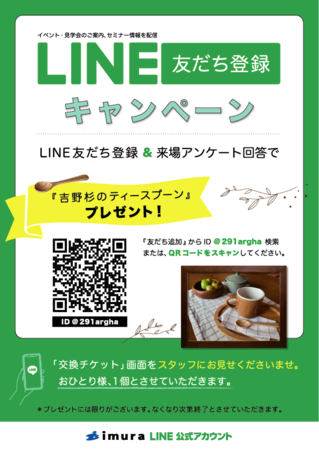 LINEの友だち登録後、展示場へご来場&アンケートへご協力いただくと「吉野杉のティースプーン」をプレゼントいたします。
