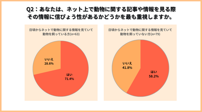 『Q2:あなたは、ネット上で動物に関する記事や情報を見る際、その情報に信ぴょう性があるかどうかを最も重視しますか。』と質問したところ、動物を飼っている方も飼っていない方も半数以上が信ぴょう性を最重視すると回答しました。