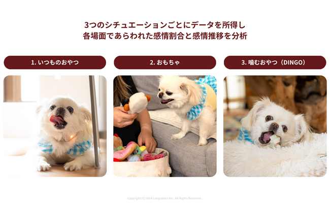 この度、ラングレスの「愛犬のこころ、もっと探求プロジェクト」は、噛むおやつのパイオニアであるDINGOを提供するスペクトラムジャパン株式会社(本社:神奈川県横浜市)とともに、遊び・普段のおやつ・噛むおやつという場面ごとの愛犬のこころを解析に取り組みました。参加者の愛犬たちの感情データを解析した結果、「噛むこと」の価値が明らかになり、飼い主たちは新しい習慣の機会が得られました。