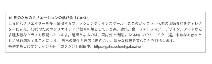 国内外で活躍するクリエイターが講師となり、新たなクリエーションと教育のあり方を発信するGAKUのクラスにぜひご注目いただけますと幸いです。