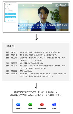 「将来、オンライン会議に求める機能」の1位は、議事録作成です。「clip EAR」を購入いただいた お客様には、ドーナッツ ロボティクス社の議事録作成、字幕表示、翻訳のwebサービスが使用できるようになります。