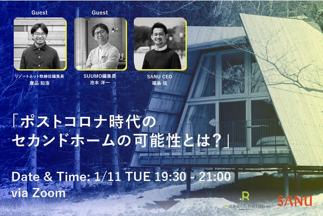 セカンドホーム・サブスクリプションサービス「SANU 2nd Home(サヌ セカンドホーム)」を運営する株式会社Sanu(本社:東京都中央区/代表:福島 弦)は、国内でのセカンドホーム市場のさらなる活性化を目指し、別荘や別荘用地の販売者と購入者をつなぐポータルサイト「別荘リゾートネット」を運営する株式会社リゾートノート(本社:東京都中央区、代表取締役:石田 一哉)と2021年12月に業務提携を開始いたしました。提携にあたり、コロナ禍以降のライフスタイルの変化によって高まる複数拠点生活へのニーズと住まいの多様化を背景とした「セカンドホーム市場が持つ可能性とは?」をテーマに、2022年1月11日(火)19:30〜ウェビナーを開催いたします。ゲストには、株式会社リゾートノート 取締役編集長 唐品 知浩氏、株式会社リクルート「SUUMO」編集長 池本 洋一氏をお迎えします。