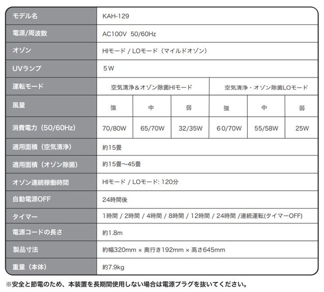 ※1Kirala Air Aria Proは最大4時間でオゾンの発生がストップします。